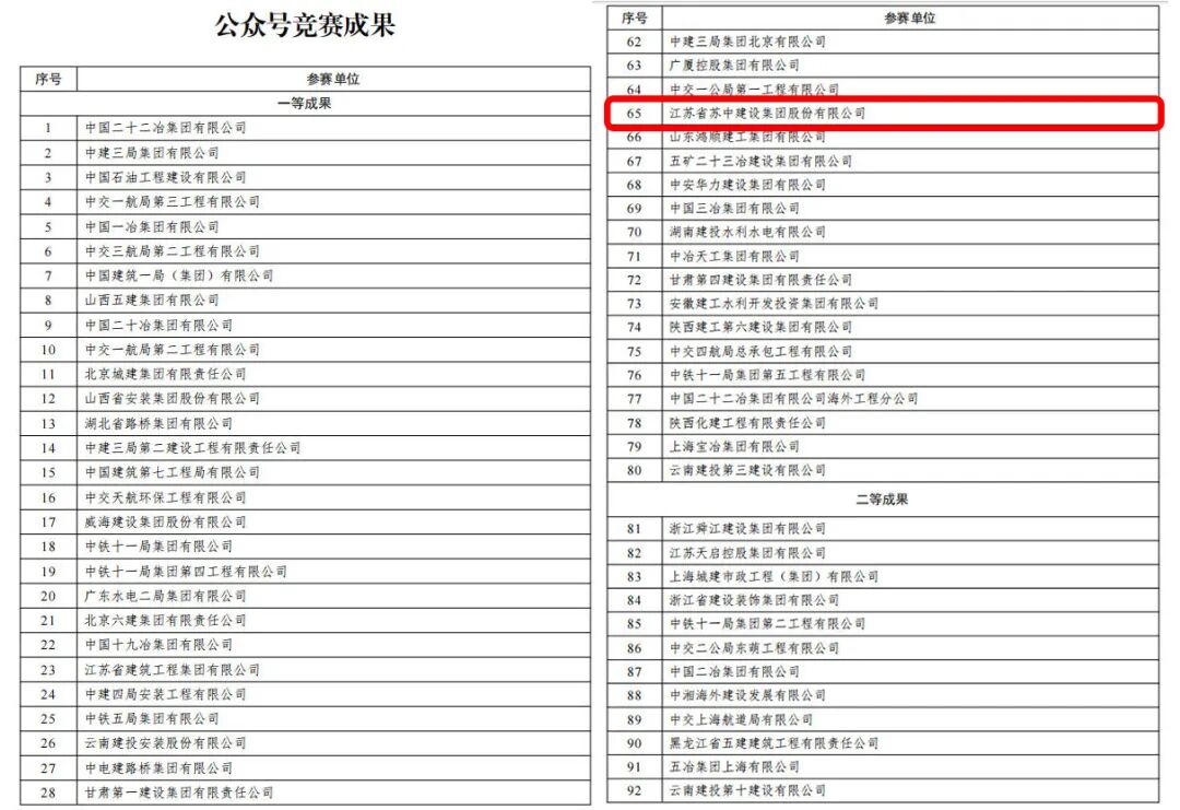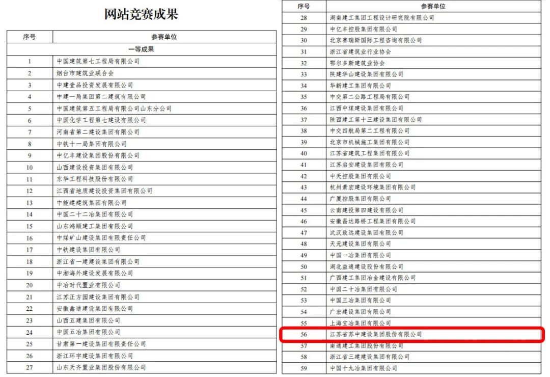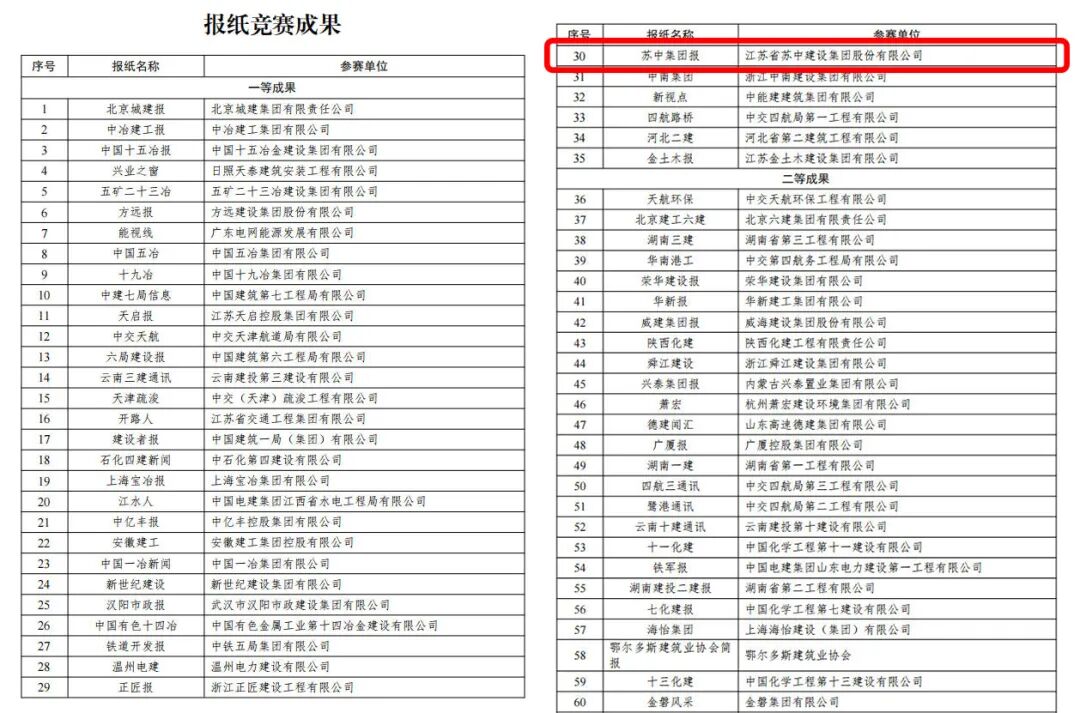 10月中下旬,中国施工企业管理协会公布了2025年工程建设企业文化建设系列活动竞赛成果,经企业申报、行业推荐、专家审核、综合评定等环节,苏中集团申报的“苏中集团报” “苏中集团年刊” “苏中集团网站” “苏中集团微信公众号”等四项企业文化建设成果分别荣获报纸竞赛、期刊竞赛、网站竞赛、公众号竞赛一等成果,集中彰显了苏中融媒体四大核心平台的行业认可度。